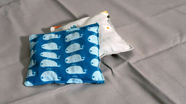 Stim toy carré avec remplis de billes en verres enveloppés dans un bout de tissus pour qu'elles ne fassent pas de bruit en s'entrechoquant.